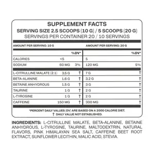 Citrulline malate (2:1), beta-alanine, betaine anhydrous, taurine, L-tyrosine, caffeine, sodium chloride, citric acid, maltodextrin, natural flavors, beet root extract (color), sunflower lecithin, stevia.